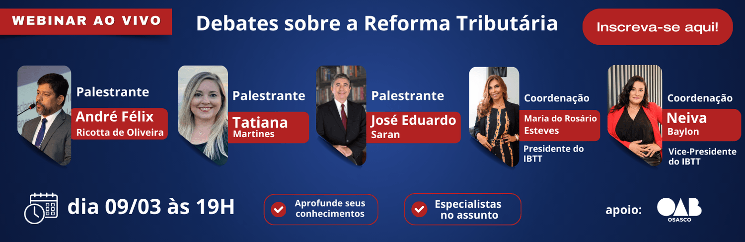 No dia 09/03, às 19h (horário de Brasília), o Instituto Brasileiro de Tributação e Tecnologia (IBTT) realizará um evento gratuito, reunindo especialistas e lideranças do setor para discutir os principais pontos da Reforma Tributária, seus avanços, desafios práticos e reflexos no ambiente econômico nacional.